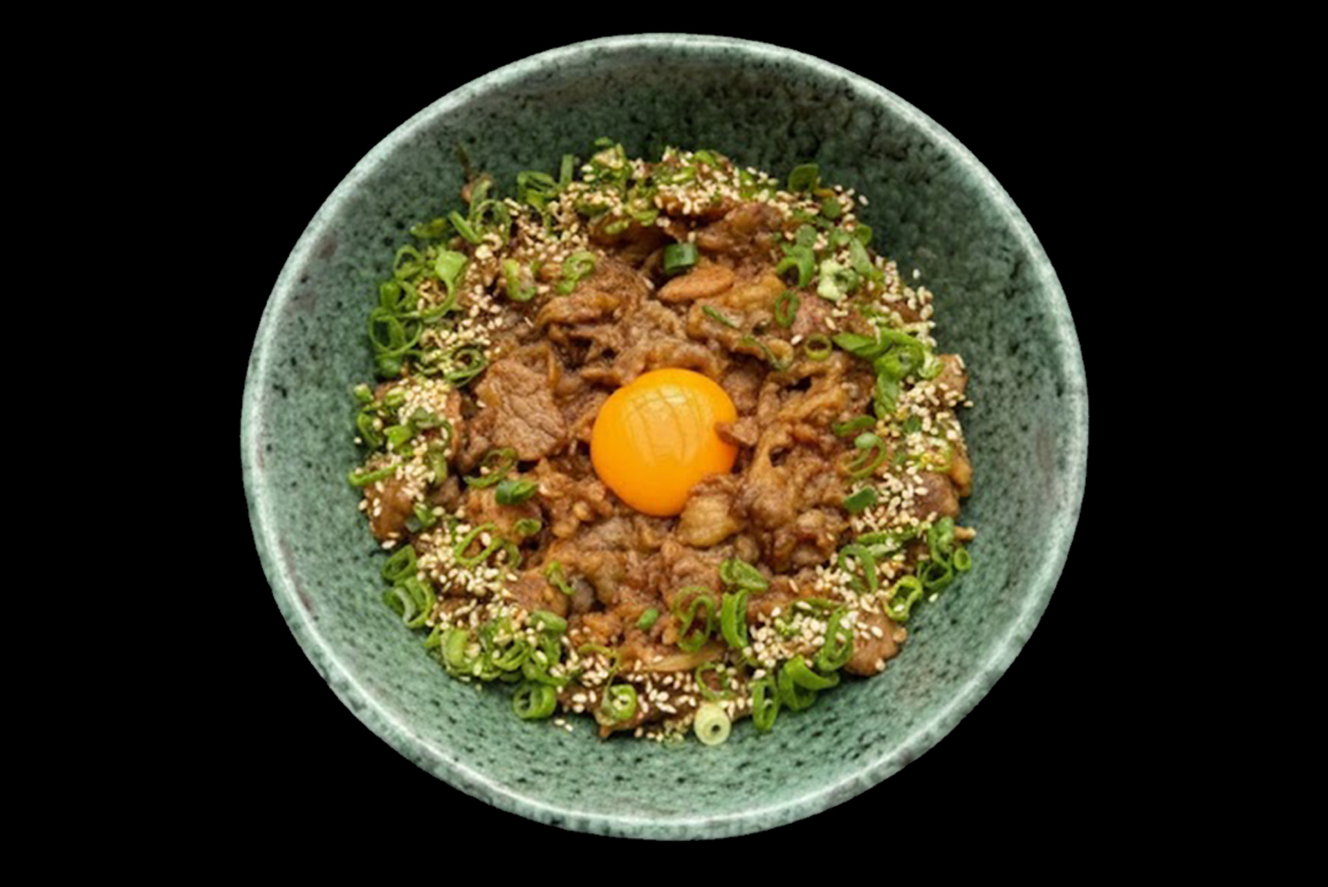 Ryż jaśminowy / duszona wieprzowina z cebulą / lekko słodki sos sojowy / dymka / żółtko / sezam / furikake nori