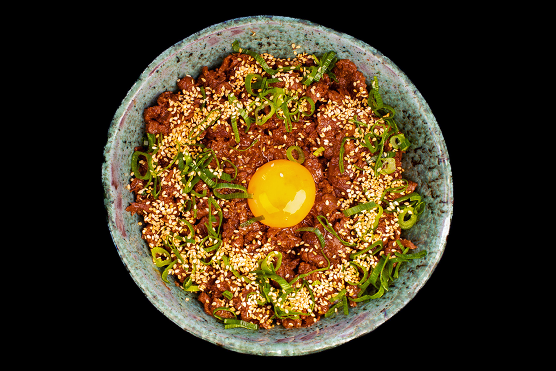 Ryż jaśminowy / duszona wołowina z cebulą / lekko słodki sos sojowy / dymka / żółtko / sezam / furikake nori