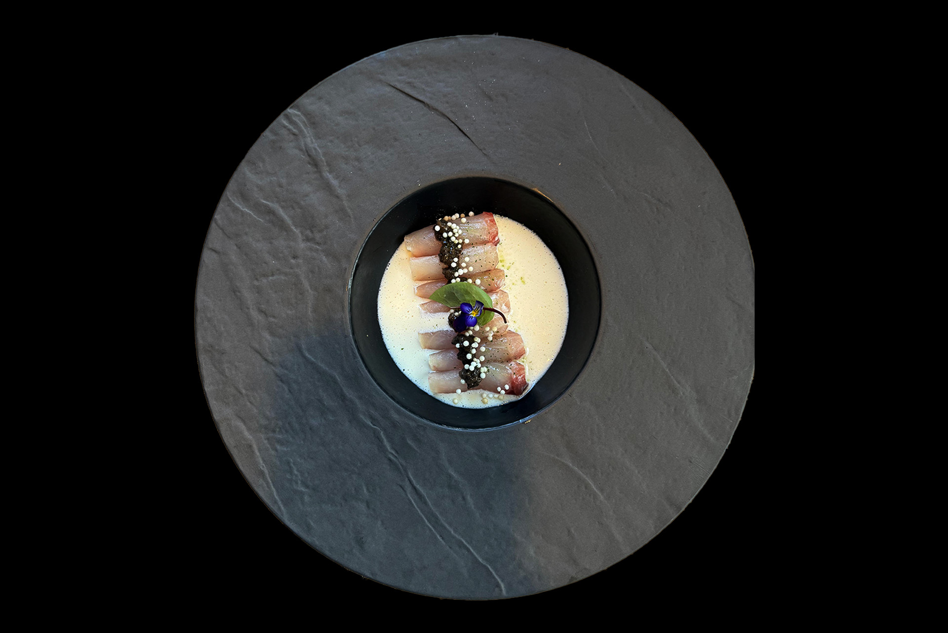 Hamachi / yuzu majo / pasta truflowa / tobiko arare / groszek wasabi