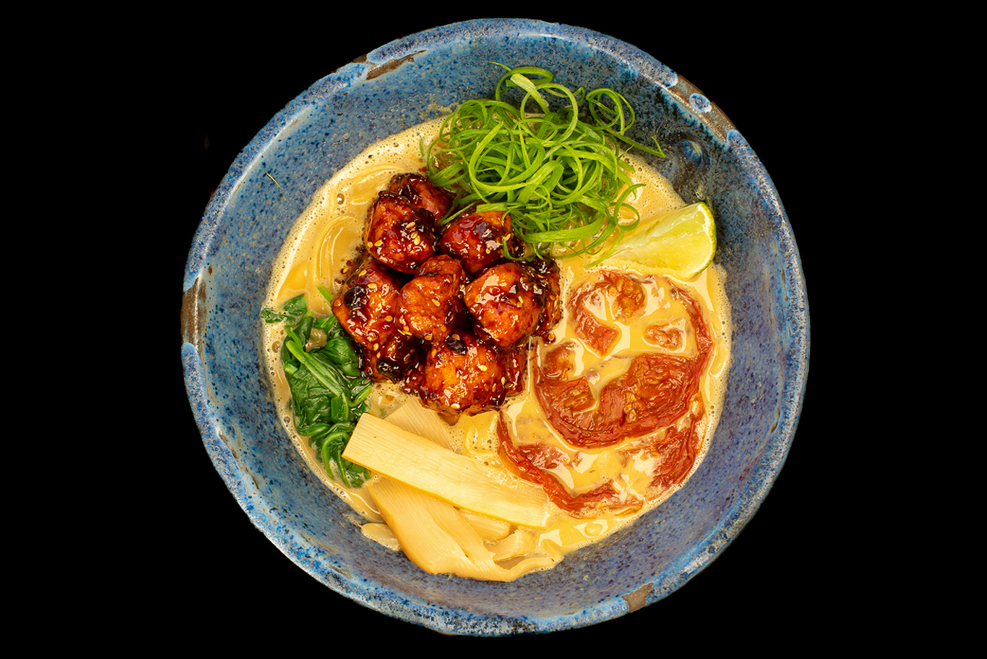 Ramen na bulionie wegańskim. Tofu karaage / pieczony pomidor / menma / szpinak blanszowany / dymka / limonka / olej czosnkowy