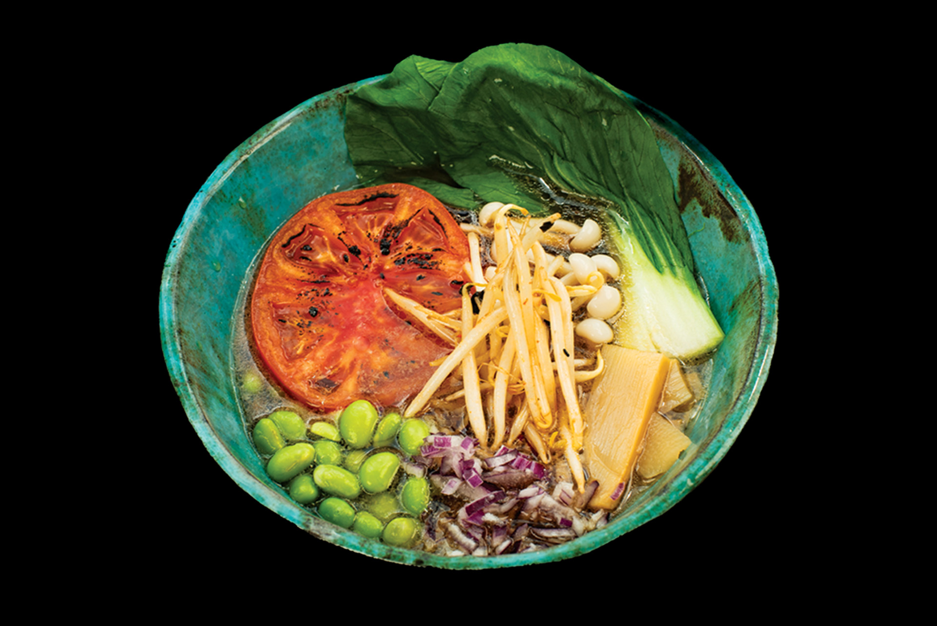 Pieczony pomidor / shimeji / kiełki mung / edamame / pak choi / czerwona cebula / menma / olej z palonego pora
