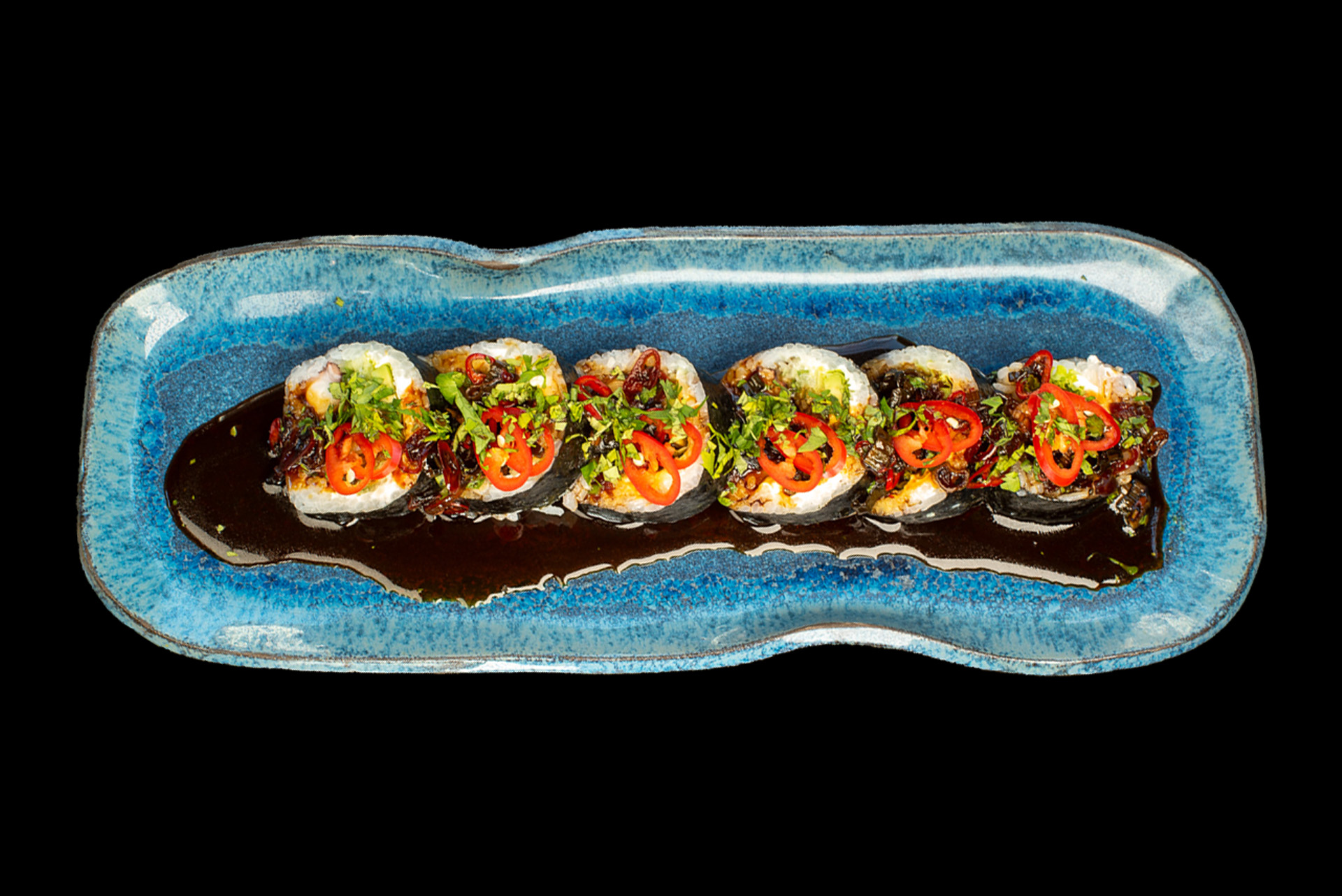 serek, sałata, awokado, ogórek, oshinko, papryczka chilli, kolendra, smażona ośmiornica, lekko słodki sos ostrygowy